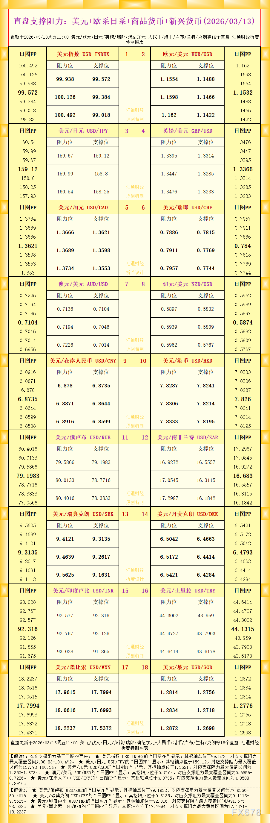 汇通财经APP讯——一张图看直盘支撑阻力:美元+欧系日系+商品货币+新兴货币配资费用对比,更新于2026年3月13日周五11:00,具体美元/欧元/日元/英镑/瑞郎/澳纽加元+人民币/港币/卢布/兰特/克朗等18个直盘,更多详见汇通财经析若特制图表中的内容。
